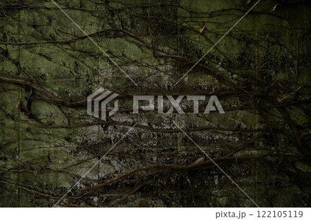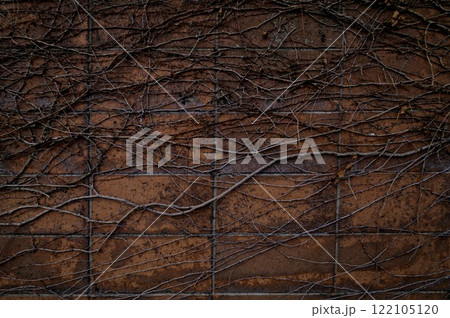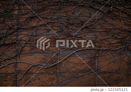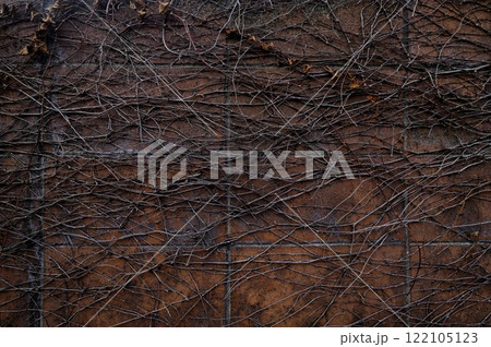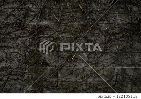 枯萎的常春藤和落葉緊貼在混凝土牆上