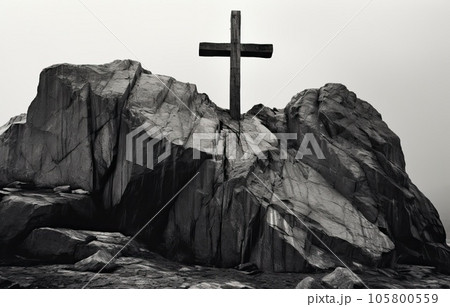 Silhouette cross on Calvary mountain sunset background. Easter, Christmas concept.