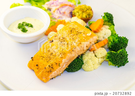 Fried salmon steak with vegetables