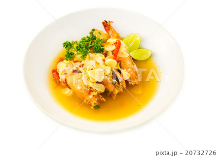 Boiled king prawns with garlic. isolated on white.