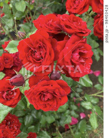 許多紅玫瑰在雨中濕潤