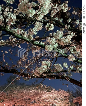 櫻花在夜和櫻花反射在水面上