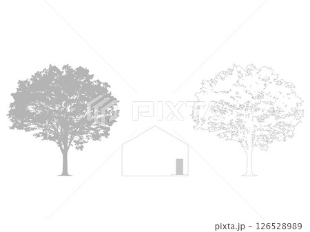 櫸樹與住宅圖像_2 件套輪廓和輪廓向量插圖_用於建築圖紙