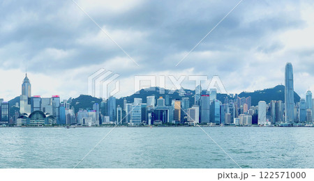 從維多利亞港俯瞰香港白天的摩天大樓和山脈全景照片