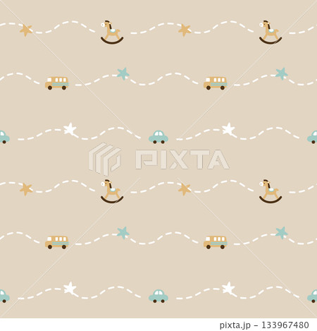 seamless minimal baby toy rocking horse car and bus repeat pattern background, flat jpg illustration graphic design