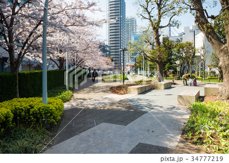 Hamarikyu花園的葉子和汐留的摩天大樓
