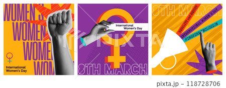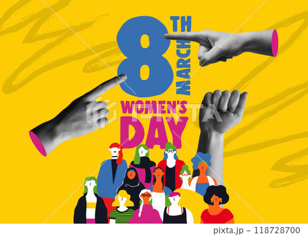 Women Day 8th March feminist power sing retro collage vector illustration
