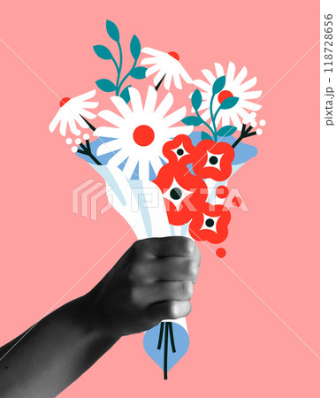 Hand with pink flowers bouquet in collage vector card illustration