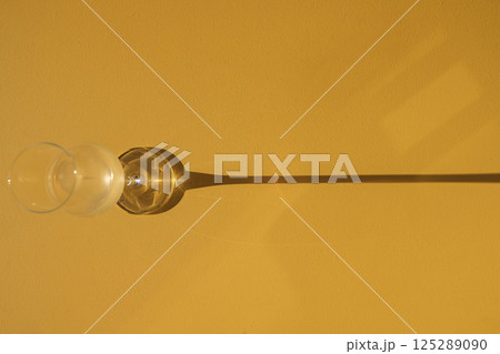 A close-up of glass with alcoholic beverage on a yellow background. Cup with sparkling wine. Top of view. Champagne goblet on a bright backdrop.