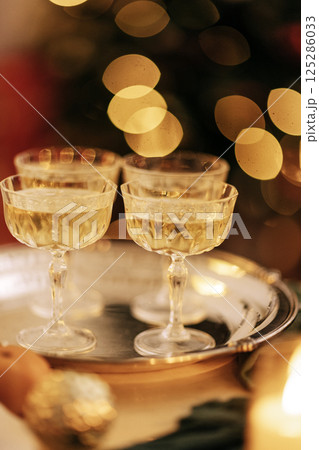 Close-up of four glasses of champagne on a beautiful metal tray.
