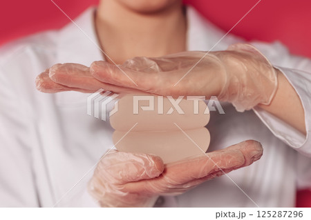 Close-up of a woman hands in transparent gloves holding silicone round breast implants. The hands of a female surgeon with modern thoracic endoprostheses.