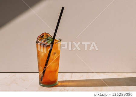 Two colorful delicious cocktails on the ocean. Glasses with cool drinks and pieces of fruit near the clear blue water on the shore.