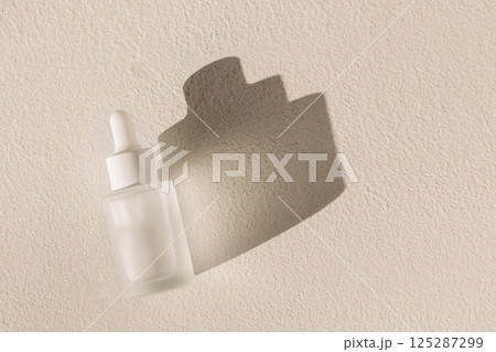 A mock-up of a bottle of moisturizing serum with a pipette on a textured white background. Frosted glass flask with an anti-aging essence dropper.