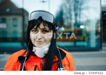 Exhausted female paramedic in full uniform feeling down at emergency vehicle