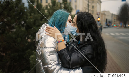 Lesbian young woman comes and hugs her partner with coffee cup in hands