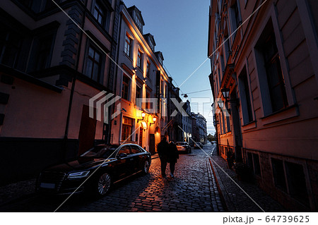 Old Riga at night, Latvia, Europe - People walking in a historic streets of the european capital