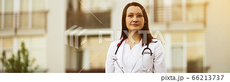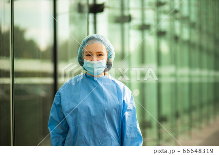 Serious medical intern looks at camera in front of hospital wearing medical mask