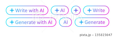 Write with AI button. AI creative stamp. Artificial intelligence symbol. Gradient blue purple digital AI robot sign. Magic star smart assistant. Vector illustration isolated on white background