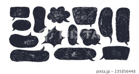 Crayon speech bubble set. Black doodle text frame. Hand drawn pastel comic dialog box. Chalk texture speech bubble. Chat message balloon. Cloud shape. Vector illustration isolated on white background