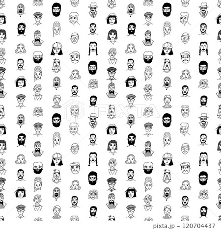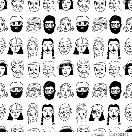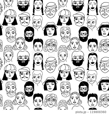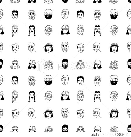 People doodle seamless pattern. Vector black white trendy endless illustration set of faces or portraits drawing of grandmother, grandfather, son, daughter, father, mother on white background