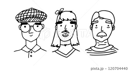 Three line cartoon people with hats. Black white hand drawn people heads faces with goatee, mustache. Vector set of illustrations on white background
