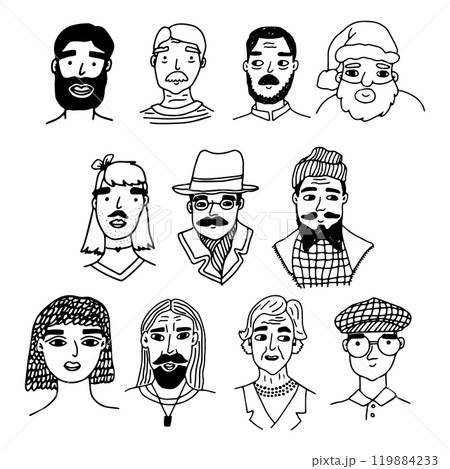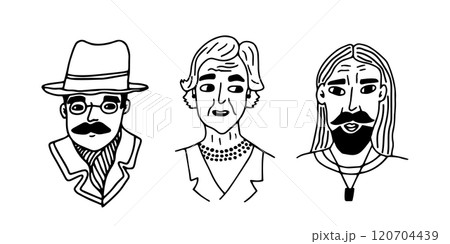 Black white hand drawn cartoon outline people heads faces. Two men with mustaches and one old woman with wrinkles and glasses. Vector line illustration on white background