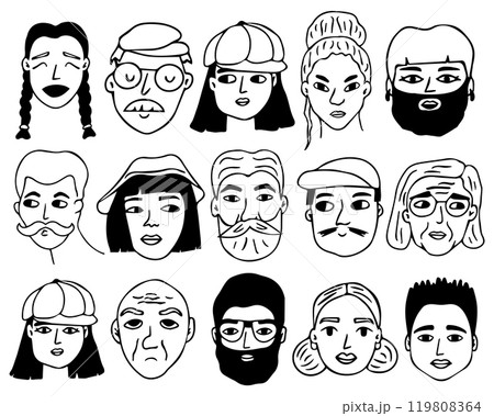Line black white group of faces or heads portraits drawings. Set of modern isolated vector hand drawn illustration on white background
