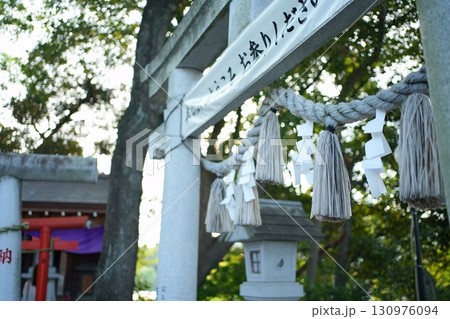清晨的玉川淺間神社神聖的鳥居-隨風搖曳的紙幡(東京大田區)