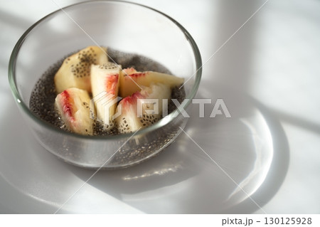 由鬆脆的奇亞籽和多汁的桃子組成的健康甜點,口感香甜,入口即化