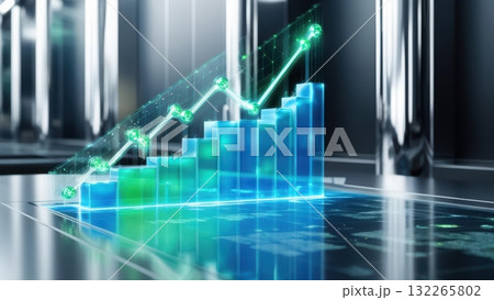 Luminous 3d holographic financial chart integrated with a green line graph in a futuristic setting