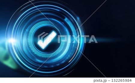 Neon blue checkmark pulsating with blockchain energy displayed on digital ledger with modern design