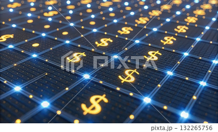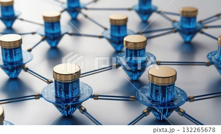 Blockchain-powered financial virtualization featuring group of blue and gold objects for banking solutions