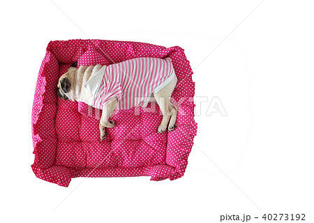 Cute dog Pug with sweet pink hat sleep rest on pad