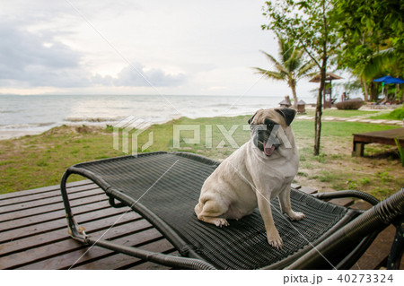 Alone pug dog tongue out sad and sit on beach