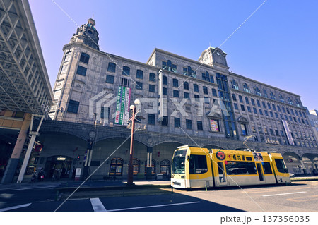 鹿兒島市電車正行駛在山形屋書店門前。