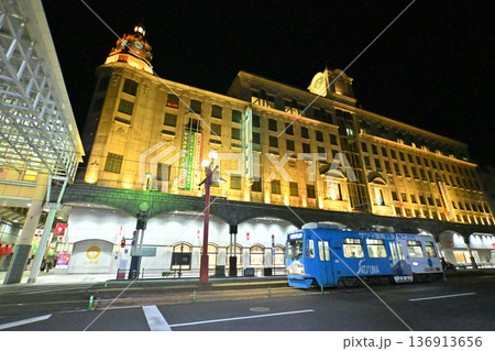 夜幕降臨,鹿兒島市有軌電車駛過山形屋門前。
