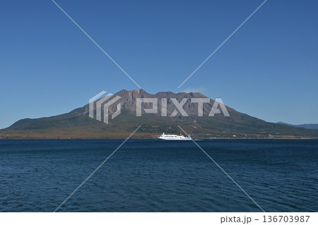 晴朗的一天,櫻島和貨船。