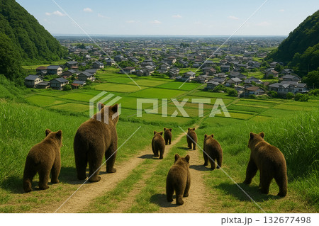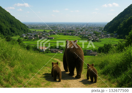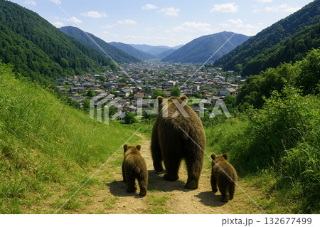 人工智慧生成的圖像(母熊帶著幼崽進入村莊)