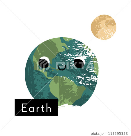 Earth with Moon. Cute kawaii planet character with smiling face. Funny celestial body. Solar system. Astronomy for kids. Vector flat cartoon illustration