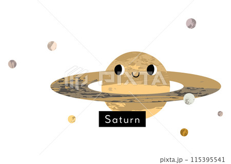 Saturn. Cute kawaii planet character with smiling face. Funny celestial body. Solar system. Astronomy for kids. Vector flat cartoon illustration
