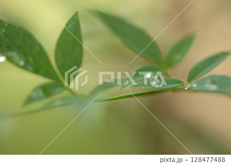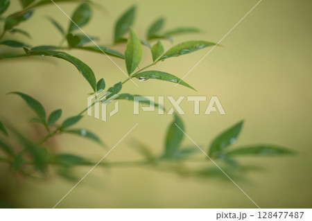 南天竹葉上水滴的特寫