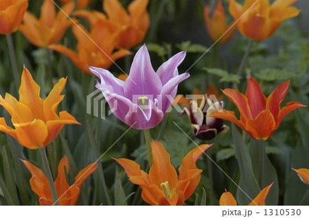 我發現鬱金香田裡只有一朵紫色的花盛開和特寫。