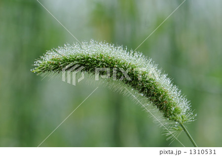 在夏天的早晨,我拍攝了附有水滴的閃亮enokorogasa的特寫鏡頭。