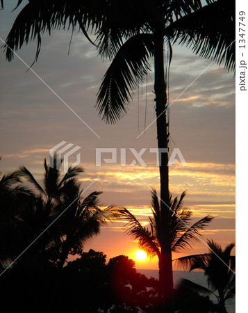 它是夏威夷歐胡島的日落美景。太陽落在棕櫚樹和大海上。