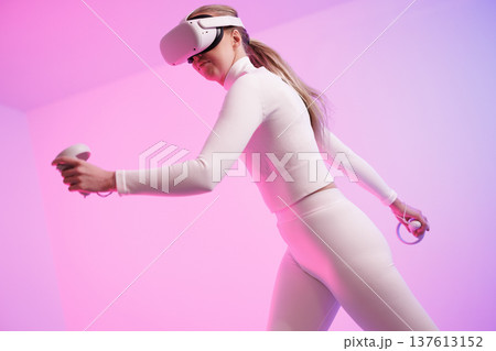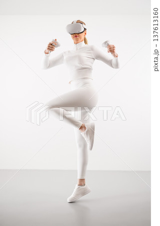 Female in VR glasses practicing martial arts in studio