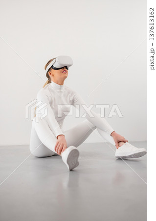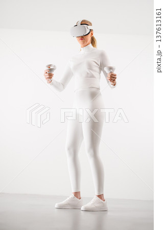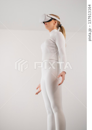 Woman in VR glasses walking in illuminated studio