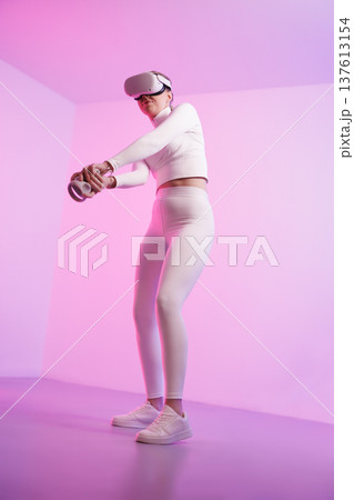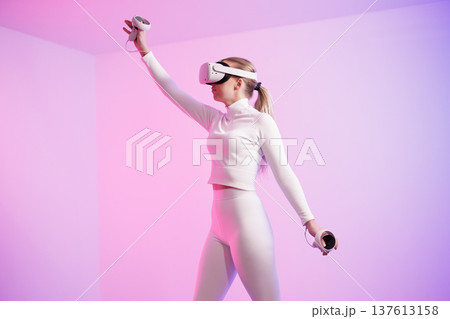 Woman in VR glasses against neon background