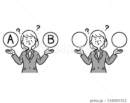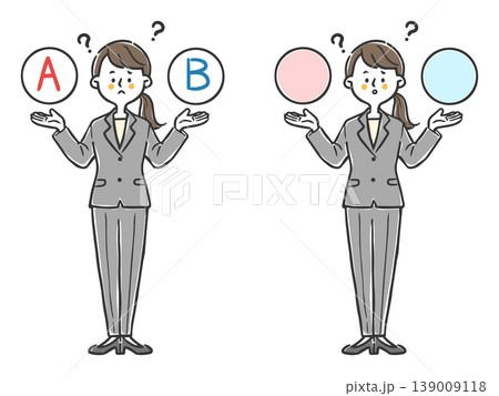 在A和B之間做選擇;一位女上班族正在努力做決定;全身像;向量圖