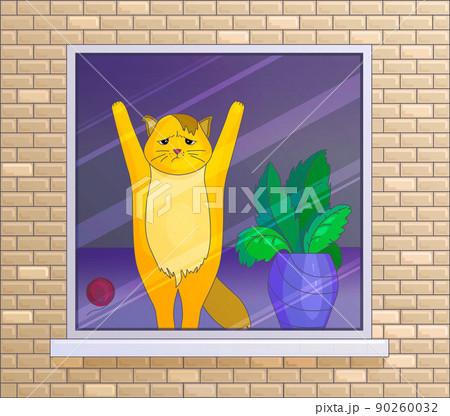 Orange cat standing by window waiting. Pet looking out window
