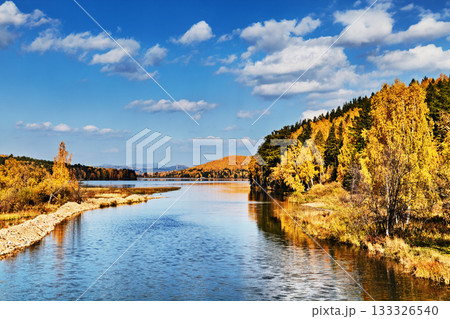 Forest in autumn colors and river